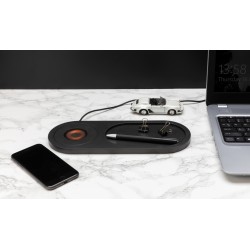 Vide poche avec chargeur à induction 10W avec bobine apparente, pour garder votre bureau rangé et charger votre téléphone sans fil. Câble micro USB de 150 cm. Compatible avec tous les appareils QI comme Android dernière génération, iPhone 8 et plus. Entrée 5V/2A. Sortie induction: 9V/1.1 10W. Modèle déposé®